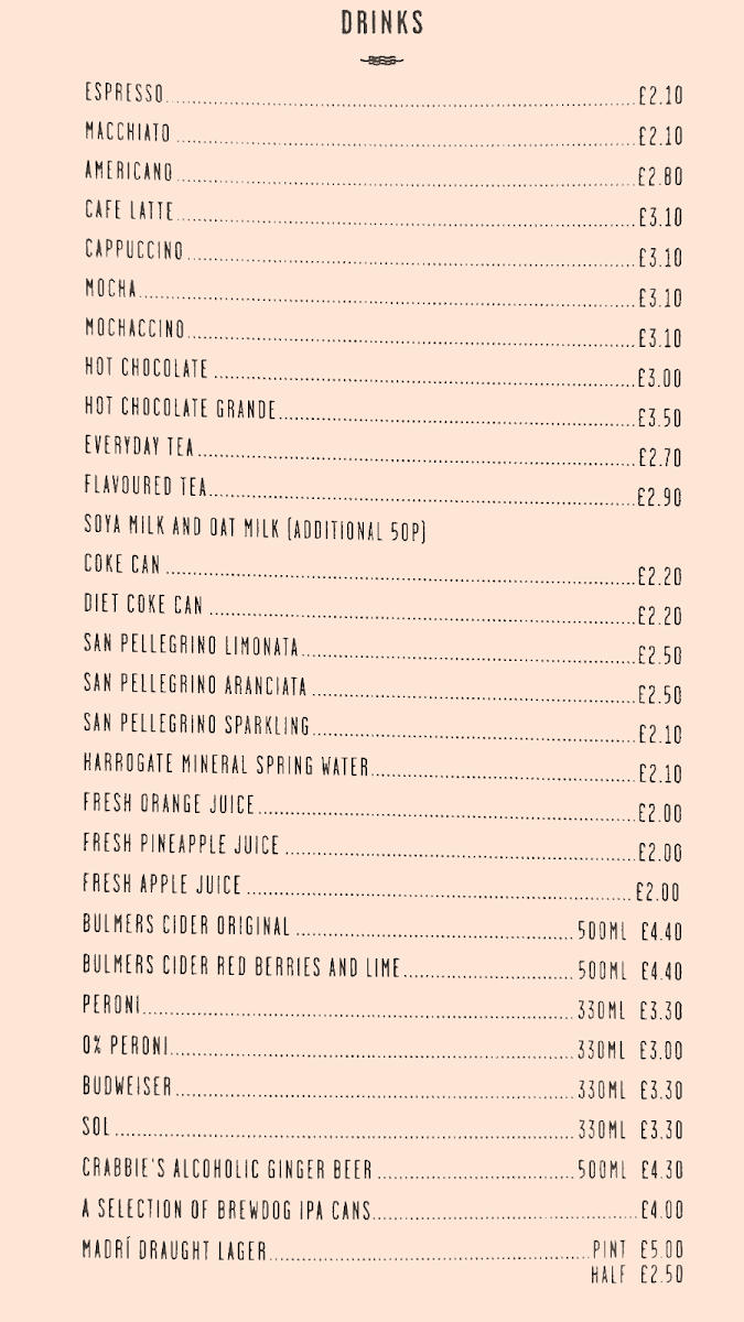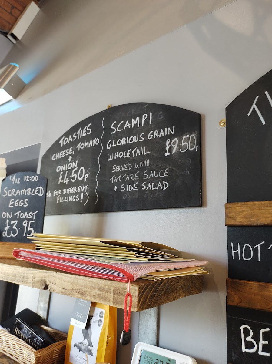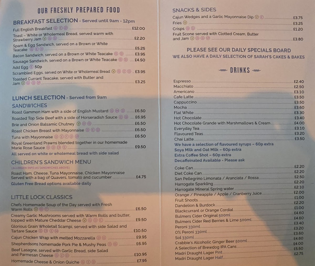 Breakfast Selection: The breakfast menu features traditional choices such as a Full English Breakfast, as well as lighter options like toast, scrambled eggs served on white or wholemeal bread, and a variety of sandwiches served on brown or white teacakes. This section is designed to cater to morning customers seeking hearty or simple breakfast items.