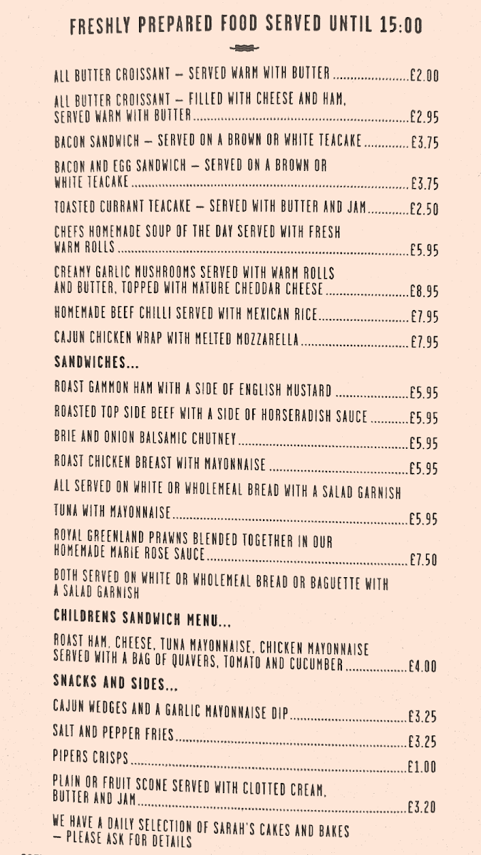 Sandwiches: Sandwich offerings include a selection of fillings such as roast gammon ham with English mustard, roasted top side beef with horseradish sauce, brie with onion balsamic chutney, roast chicken breast with mayonnaise, and tuna with mayonnaise. These sandwiches are suitable for light meals throughout the day.